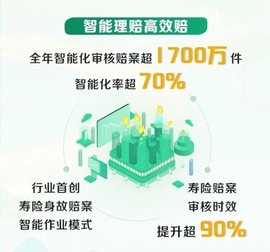 2024年全年,该公司智能化审核赔案超1700万件,智能化率超70%。行业首创寿险身故赔案智能作业模式,符合条件的寿险赔案审核时效提升超90%。